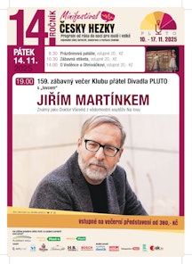 159. zábavný večer Klubu přátel Divadla PLUTO s ,,lovcem´´ JIŘÍM MARTÍNKEM. Známý jako Doktor Vševěd z vědomostní soutěže Na lovu. Akci moderuje Jiří Bláha.