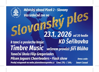 Srdečně Vás zveme na Slovanský ples, který se uskuteční v pátek 23.1. 2026 v Kulturním domě Šeříkovka. K poslechu a tanci zahraje kapela Timbre Music. Těšit se můžete na retro hudební bloky i na doplňková taneční vystoupení.